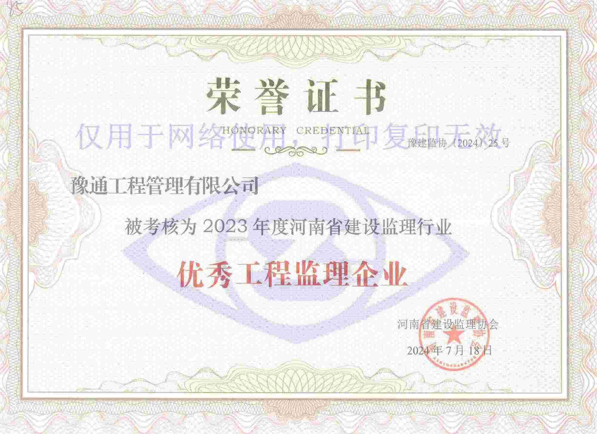 近日,河南省建设监理协会发布了关于公布2023年度会员单位考核结果的通知(豫建监协〔2024〕25号),我公司荣获“2023年度优秀工程监理企业”称号。